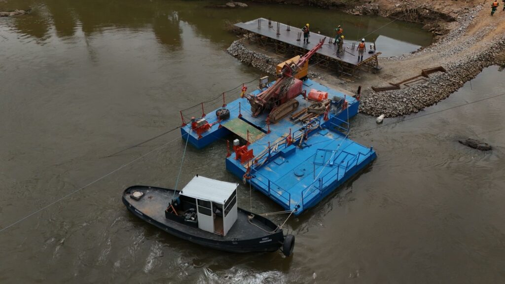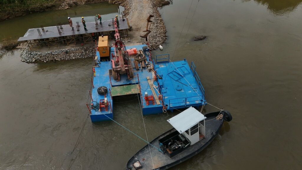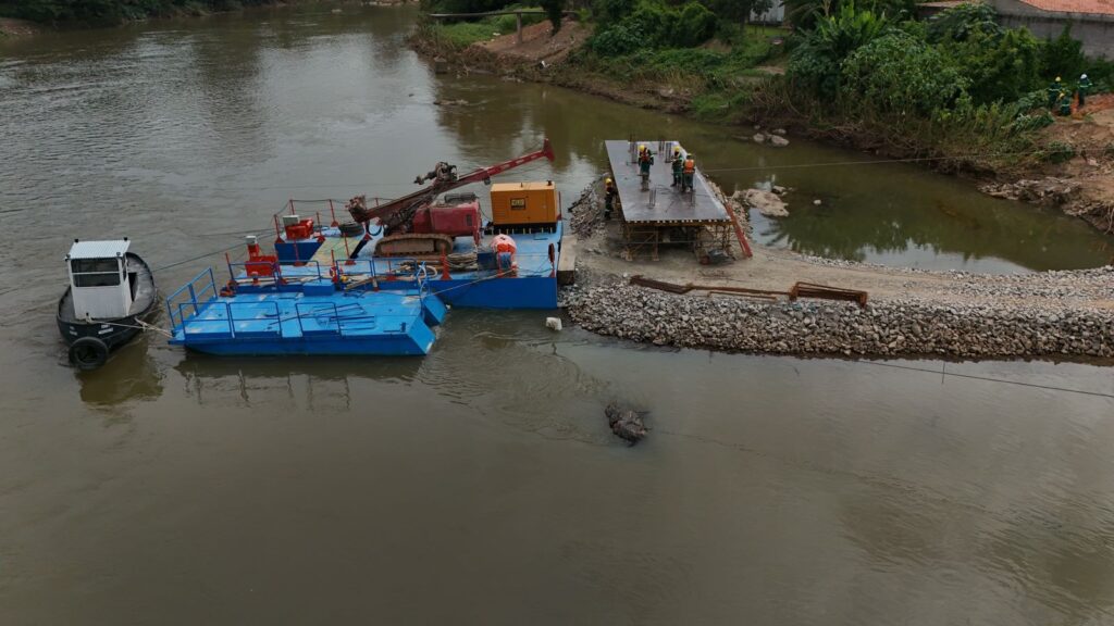 A Fortemar fornece equipamentos de apoio náutico para a execução de fundação sobre lâmina d’água, embarcando em nossa balsa uma perfuratriz com peso bruto de 20 toneladas, um gerador de energia e camisas metálicas.
